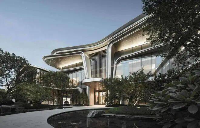 整体立面设计延续了缦云设计语言, 对“云”形态更为细腻的提取和淬炼,在强调立面的工艺品质的同时,利用极具流动美感的曲线叠加,提升优化了建筑体量,令建筑充满未来感和标识性,立面形态更加飘逸,富有张力。