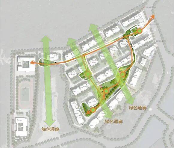 出入口正对中央景观,东南侧则设置次要出入口与幼儿园出入口,以不同的高度差分隔各个流线,使其不会相互交错,造成交通组织混乱。