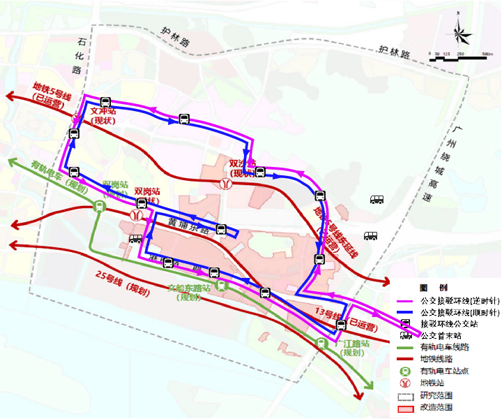 强化区域公共空间共享加强内部公共交通覆盖,综合轨道、有轨电车、公交首末站设置公交接驳环线,区内设置慢行规划天桥,交通动线统一。