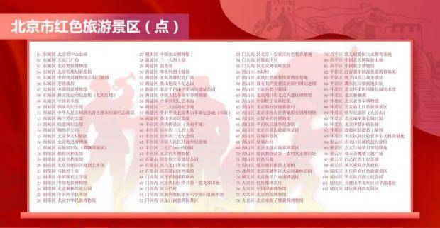 一座座红色地标为一段段光辉的历史做着鲜活的注脚。102家红色旅游景区如一颗颗闪亮的红星,映照着京华大地,吸引着全国的游客“心向北京”。今年评出的北京市红色旅游景区(点)分布在北京16个区,包括位于东城区的北京市中山公园,西城区的郭沫若纪念馆,朝阳区的北京市档案馆,海淀区的三一八烈士墓,丰台区的卢沟桥景区(含宛平城),石景山区的首钢工业遗址公园,门头沟区的平西情报联络站,房山区的花港红色洞渠情景教育基地,通州区的北京市通州区大运河森林公园,顺义区的北京焦庄户地道战遗址,大兴区的红星集体农庄,昌平区的狼儿峪爱国主义教育基地,平谷区的红谷冀东抗战党史教育基地,怀柔区的北京庙上红色旅游景区,密云区的古北口长城抗战纪念园,延庆区的大庄科乡红色旅游景区等。