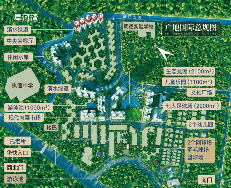 新推的 31 栋小高层楼间距做得不错,10 楼以上的户型能远眺珠江支流和远处的小蛮腰夜景;