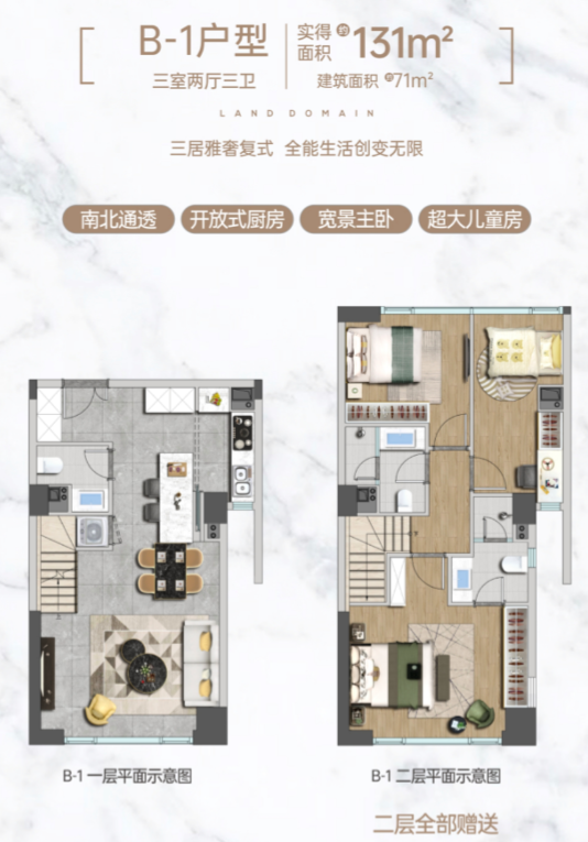 主城稀缺复式产品,5.4米层高,赠送高,买70㎡可得约130㎡左右三房三卫。在主城买平层130㎡,基本是三房两卫户型,也无法实现动静分区,再加上公摊面积,最终实得不到100m²。