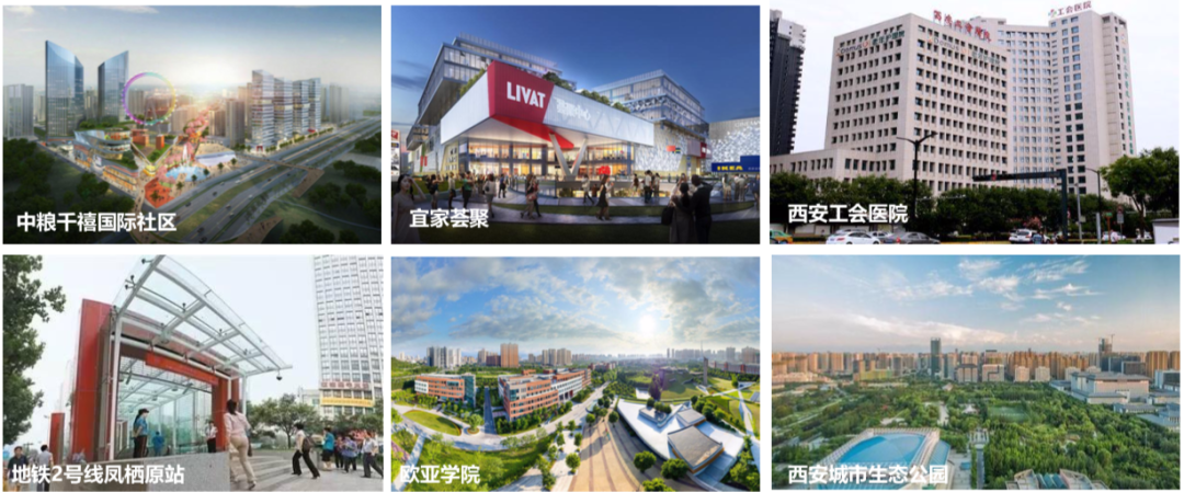 周边全维度配套资源环绕,已经呈现的有:地铁有2号线凤栖原站;自驾有城市干道西部大道上联通曲江和高新等区域;多个配套都是“一路之隔”,西侧是长安中央公园,东侧是清凉山中央公园,以及西安工会医院。