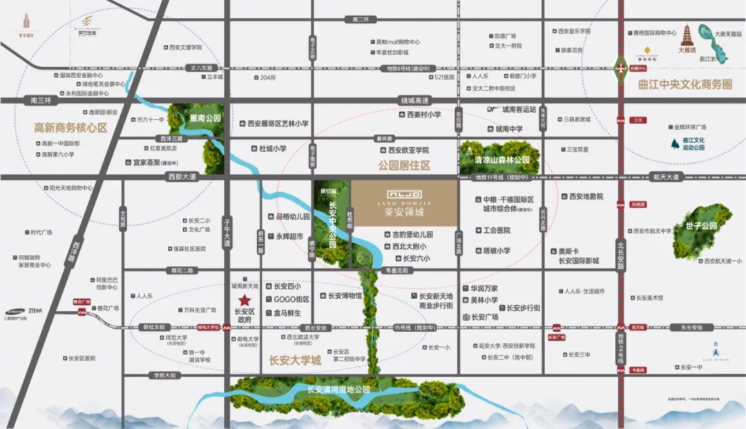 项目在西部大道上,左高新右曲江,承接2个板块优势。向西是高新,近揽高新CBD/丝路科学城等商务产业集群;向东是曲江,享受曲江的生态/文旅。