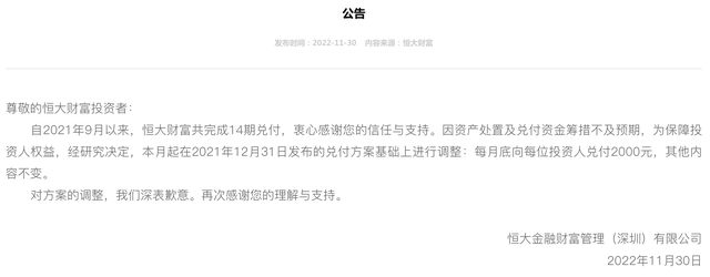 焦点财经讯 盼盼 11月30日,恒大财富发表公告称,因资产处置及兑付资金筹措不及预期,自本月起对2021年12月31日发布的兑付方案进行调整,将现行每人每月兑付8000元调整为每人每月兑付2000元,其他内容不变。