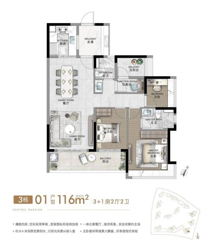 建面约116㎡4房2厅2卫(横厅),豪华主卧套房,超大270°转角飘窗,三开间南向采光,约10.4m超长南向采光。