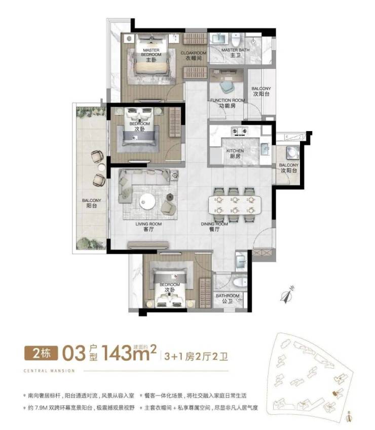 建面约143㎡4房2厅2卫,豪华主卧套房,超大 270°转角飘窗,大面宽采光面+超大方厅,约14.6m超大南向采光面,双面景观阳台+满飘窗,约7.3m 超大阳台。