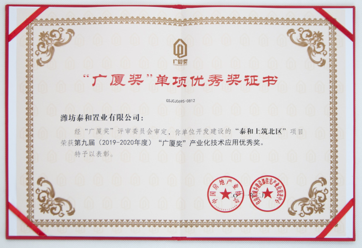 荣誉背后,是硬核实力。“泰和上筑”项目是昌大建设集团以“建设潍坊高品质小区”为中心指导思想,以“泰和上筑传承百年”为口号而精心打造的一个综合性住宅小区项目。项目在规划设计之初,就确立了建设科技、环保、绿色高档住宅小区的目标,对产品定位、材料应用、园林景观等各个环节无不匠心打磨。每一个细节,都完整体现了集团用心做建筑,“技术立企、质量兴企、服务强企”的理念。该项目除了荣获“广厦奖”,还先后荣获“住建部3A级住宅性能认定”“2017-2018年度广厦奖候选项目”“2018年度省级园林式居住区项目”等荣誉称号。