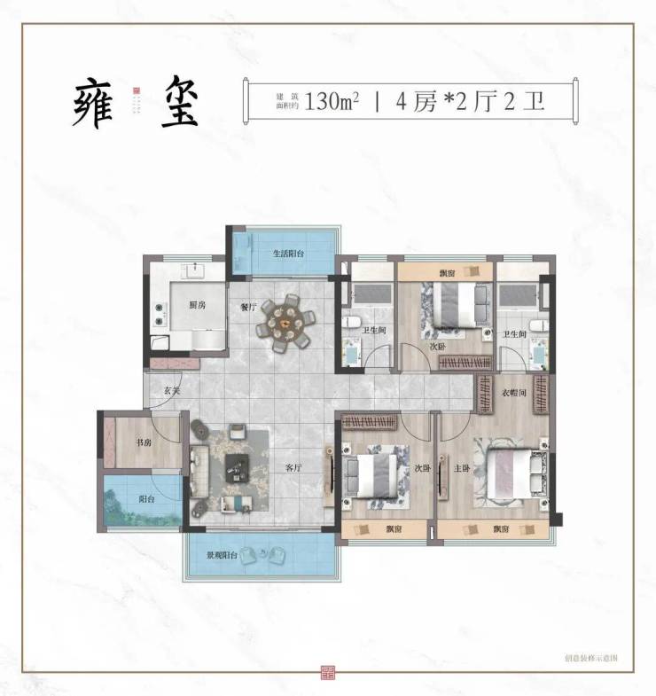 古人迎宾待客通常有“三进三请”的礼仪,通常主人会在前厅待客,宾客不得进入内院。玺悦户型将客厅、餐厅等动态区位于一边,作为休息区的卧室则分至另一边,遵循古礼,又有创新,保证会客休息互不相扰。