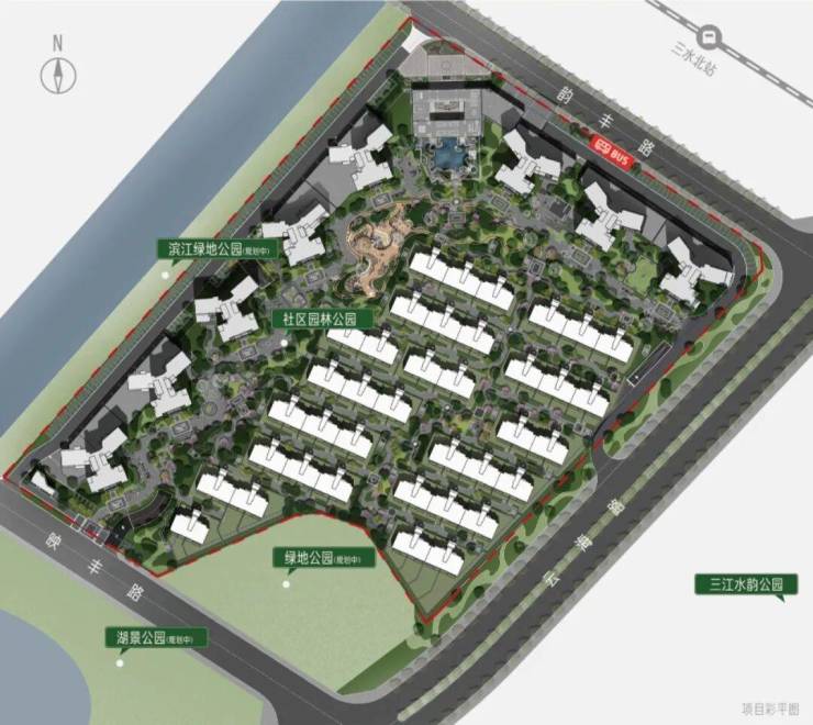 项目整体坐北朝南,临水高层采用行列式布局,相互无遮挡,栋栋揽景,可北望繁华都汇水岸夜景,南望社区园林及绿地公园、湖景公园、三江水韵公园共五重园景。近可欣赏匠心中式园林景观,远能观三水北站、双子星塔等城市名片。