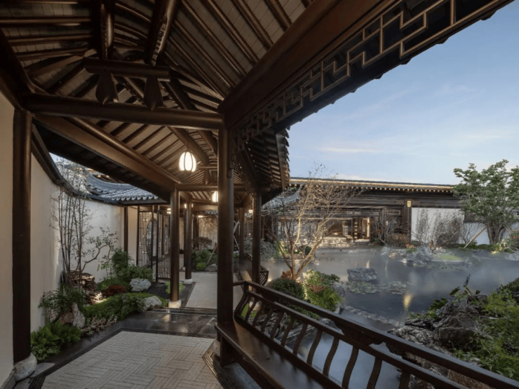 “二进”心远堂,重现了苏州古典造园手法,设有叠翠亭半亭戏台、叠石、流水、石桌案台、石凳等中式园林元素,并融入了“四水归堂”的传统设计理念,可以让雨水从四面流入天井, 与四周的亭台绿植构成惬意舒适的生活氛围。