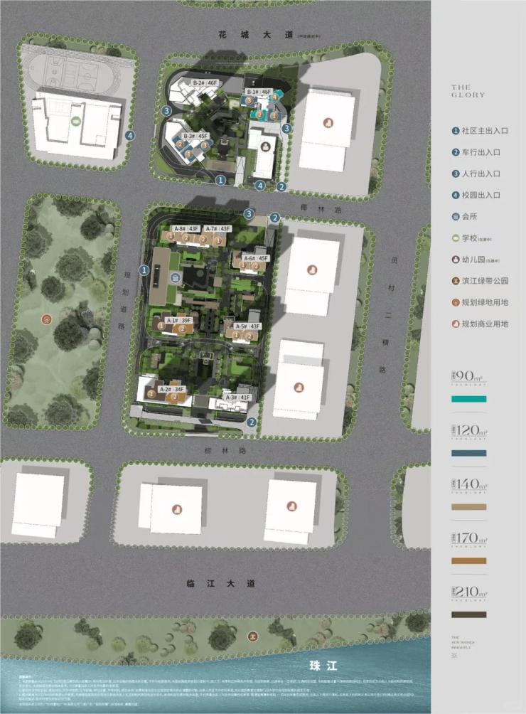 外部联动:南侧临江带状公园、西侧绿地公园(建设中)、市政口袋公园(规划中),三重绿地体系,江园共生。