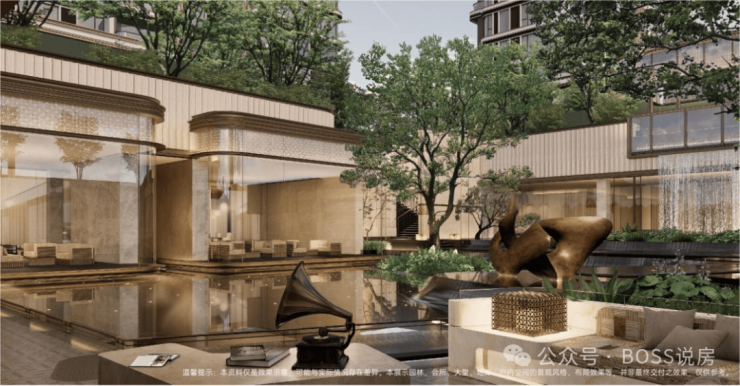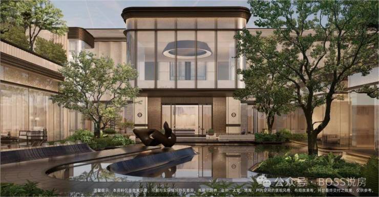 节点:主入口水景、下沉庭院、镜面水景、艺术雕塑、绿植组团,形成归家仪式与疗愈空间。