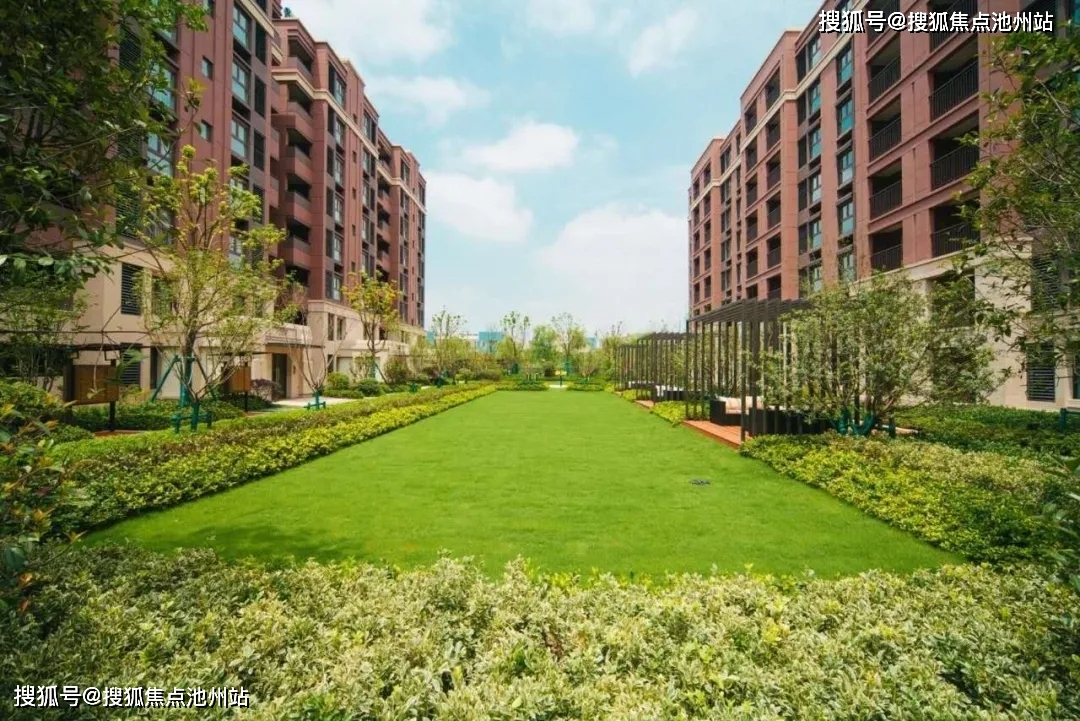 社区采用整体地块堆高,凸显园林层次感,加高地势又可以起到防水防潮的效果。项目两面环水,每栋住宅均有相对独立的景观绿色空间,绿化率高达40%。