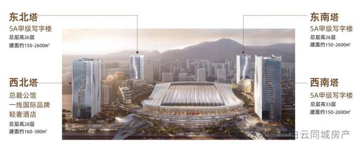 白云站TOD粤胜广场5公里范围内,聚集了超170个重点项目落户,20多栋总部大楼拔地而起,已有140家企业进驻,周围环绕6大地标!