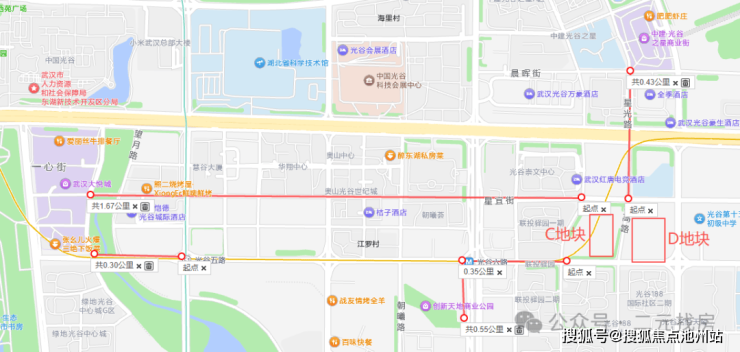 稍远一点还有武汉大悦城,距离约1.7公里,坐地铁仅1站路(光谷六路到光谷五路),然后步行300米即达。在建的还有龙湖光谷天街,距离也在3公里以内。