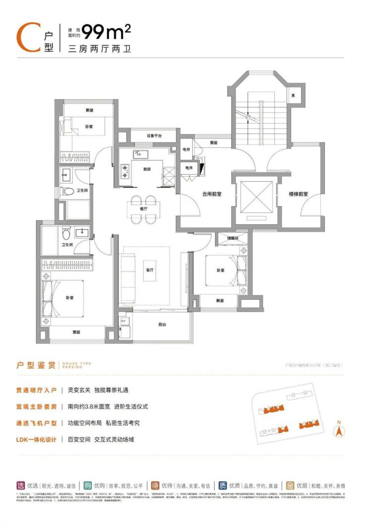 建面约99㎡3房2卫: