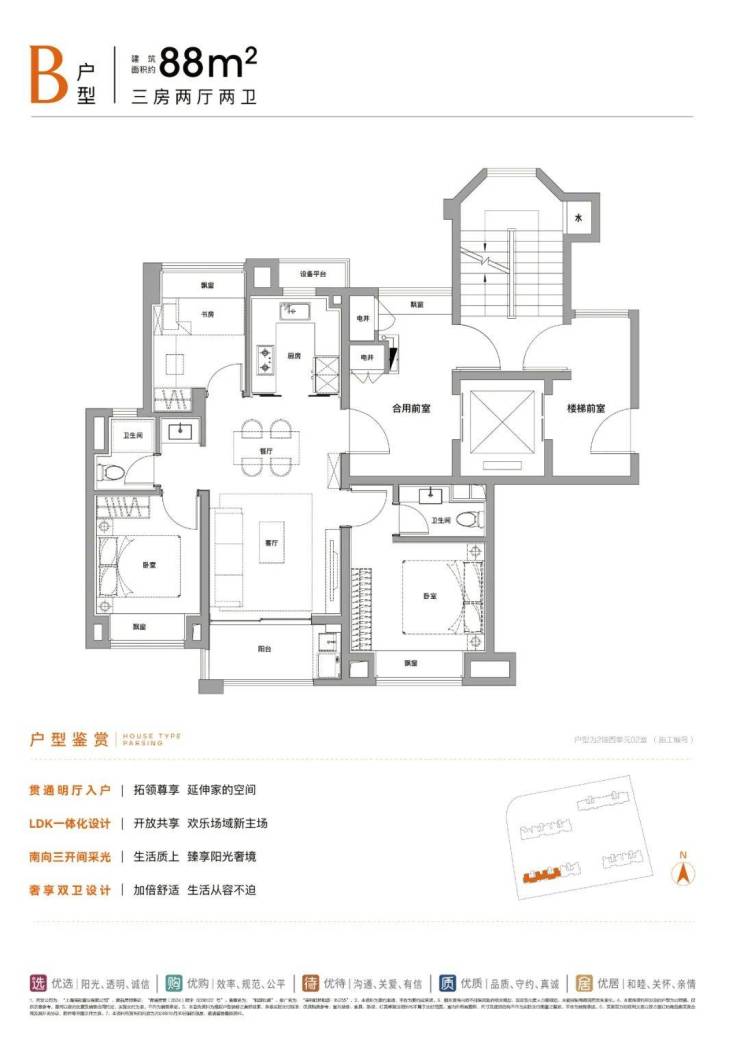 建面约88㎡3房2卫: