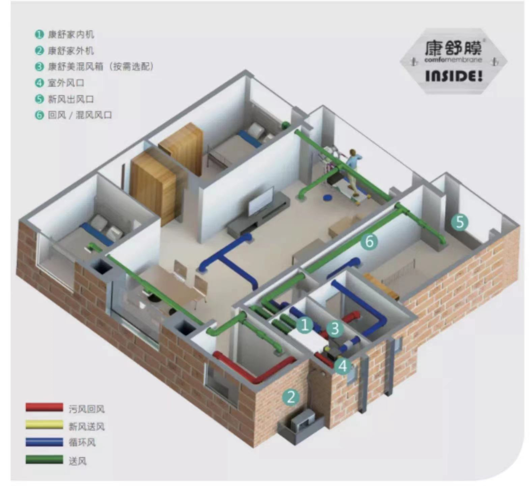 山水龙庭选用的森德康舒家新风一体机,24小时全天候、全时段全屋置换新风,并能够根据室内空气参数(CO₂浓度)自动调节新风阀、循环风阀、排风阀的开度以及EC送风机、EC排风机、压缩机的运行频率。在新风交换时,把室内空气所带来的热量充分保留,减少室内温度的流失。此外,山水龙庭还采用冷热桥规避设计,在住宅阳台、窗户、屋面、楼板等容易产生冷热桥的地方加隔热垫块,将其热桥阻断。