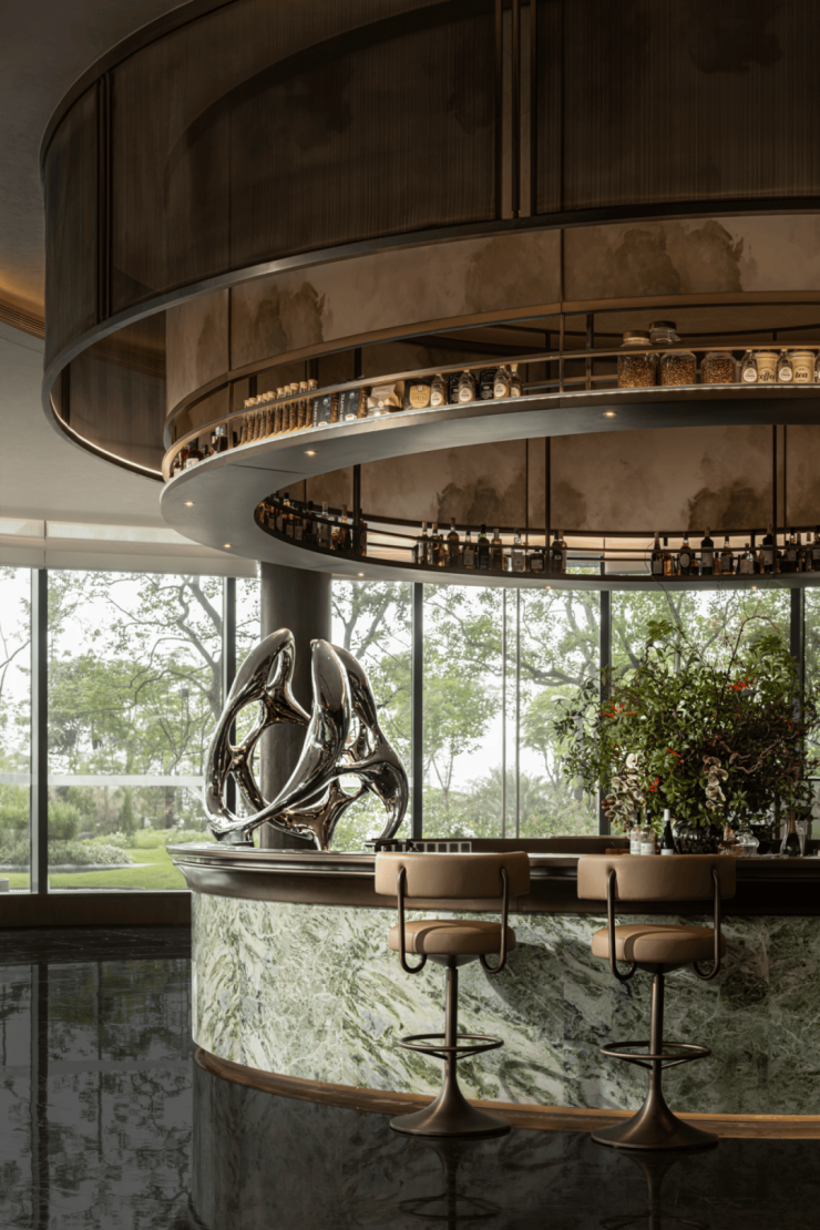 水吧区采用半围合式设计,雕塑感的吧台宛如海中的一座小岛,这里的一切如度假酒店的放松适意。