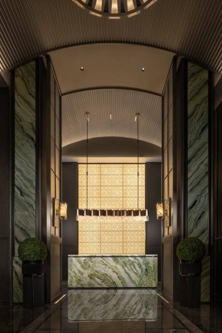 步入接待区,弧线设计体现了恰到好处的空间感,流动也灵动。翡翠色石材的应用也营造着碧波荡漾的形态,增强了空间的沉浸体验。