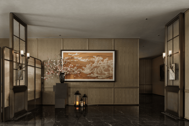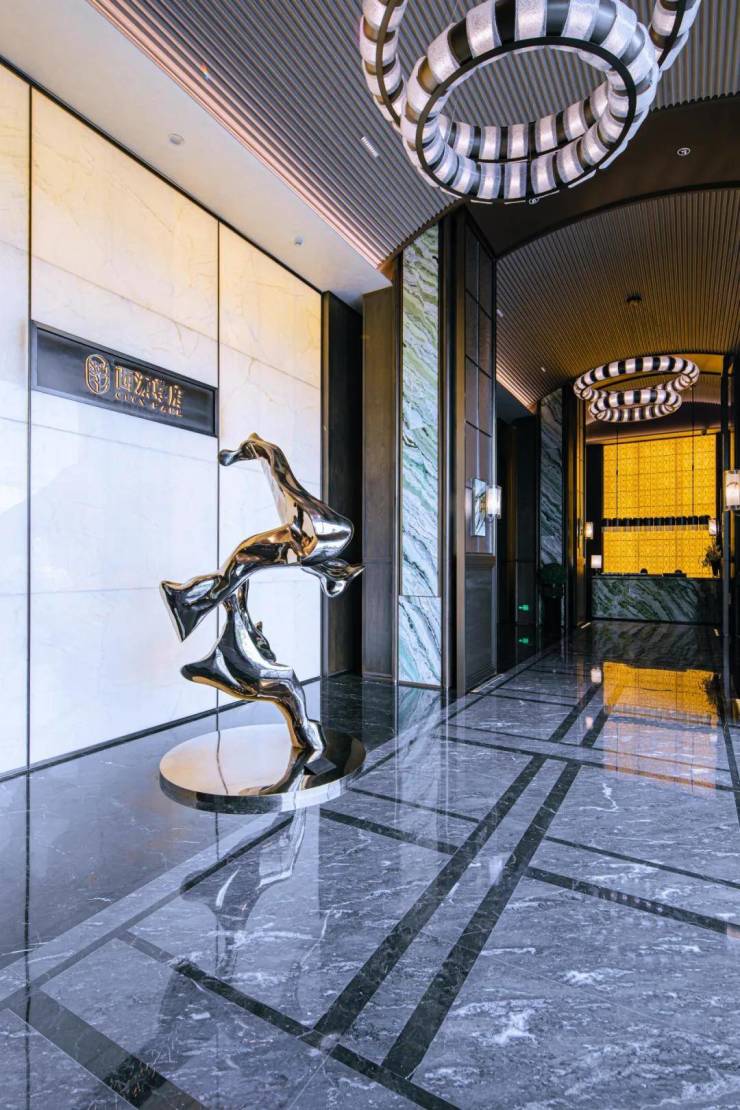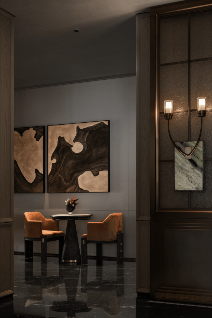 奢石、古铜金属、艺术拼花、定制屏风,奠定了空间现代优雅的设计理念,创造了新的尺度与不同的层次,为艺术预留足够的留白。