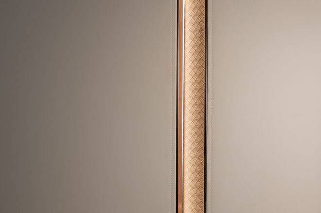 入户门用皮革精心包裹,触感轻柔顺滑,高级质感扑面而来。同时,横向竖向内嵌的金属线条增强了入户门的立体感,使这扇门兼具实用功能与艺术美感。