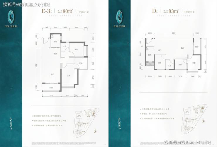 E1/E2户型(80㎡):西南向,阳台朝西,得房率83.7%-84.3%