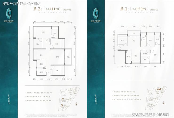 B2户型(111㎡):竖厅南北通透,客厅开间4.2米,全屋飘窗,东北向花园视野,得房率94.6%(全盘最高)