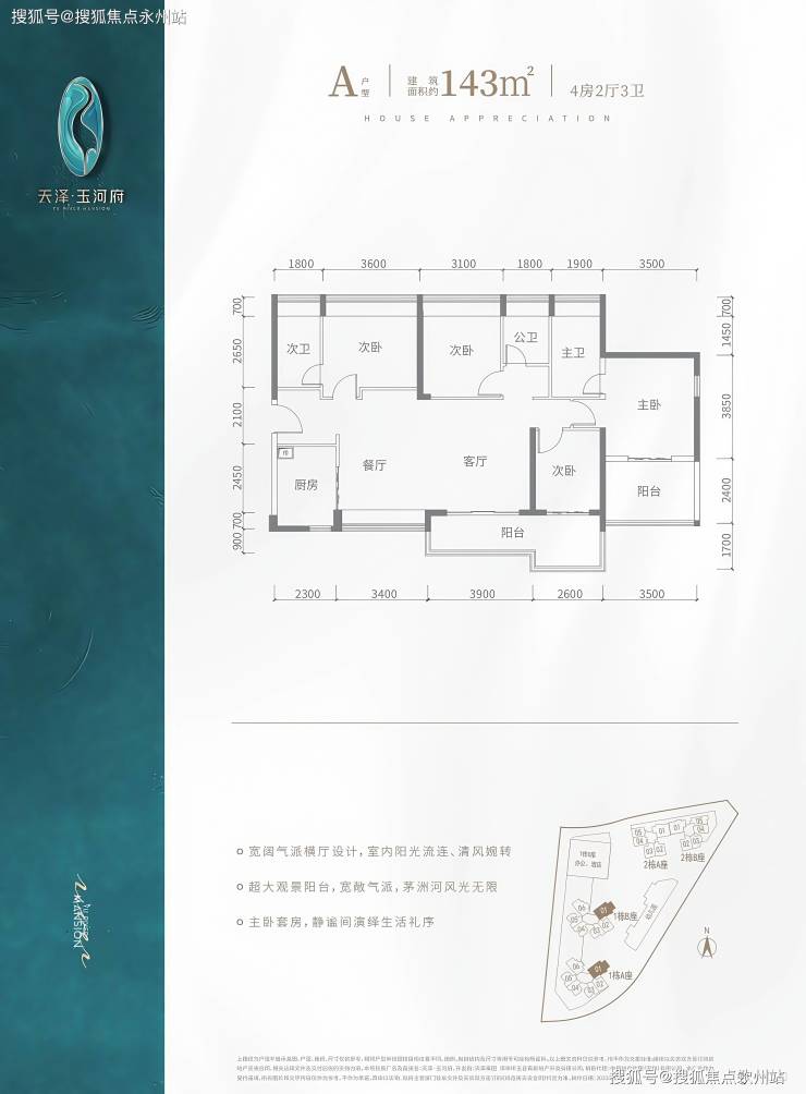 改善推荐:143㎡四房三卫(A户型),稀缺河景+横厅设计。