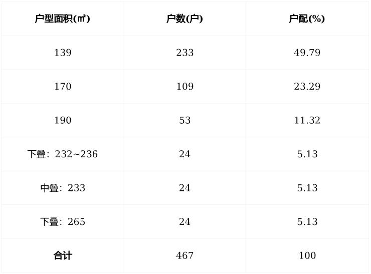 户型设计:项目户型设计一般,创新创意点较少。共6个面积段:分别是139、170、190、232~236、233、265。本项目户配以改善为主,具体户配如下: