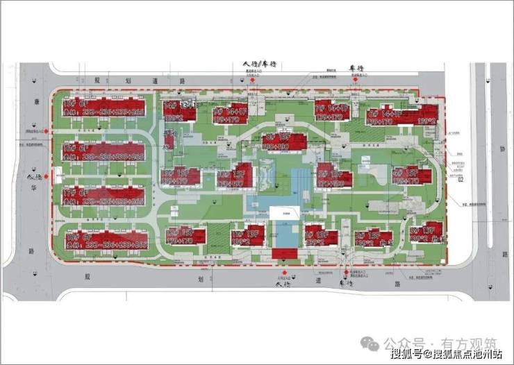 2、人行出入口:设置在北侧规划道路、西侧康华路、南侧规划道路;