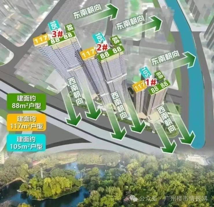 全新3栋已上新,主推建面约88-105-117㎡四房,88平三房共有3条梯腿,有东南向和西南向,105平和117平各有1条梯腿,105为东南,117是西南。