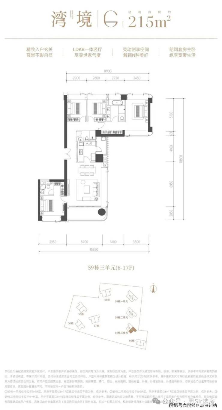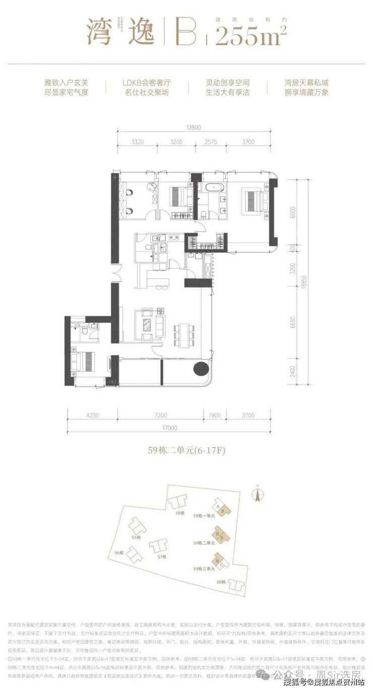 59-3栋结构类似之前的55栋,为3梯2户约215㎡和255㎡组合。