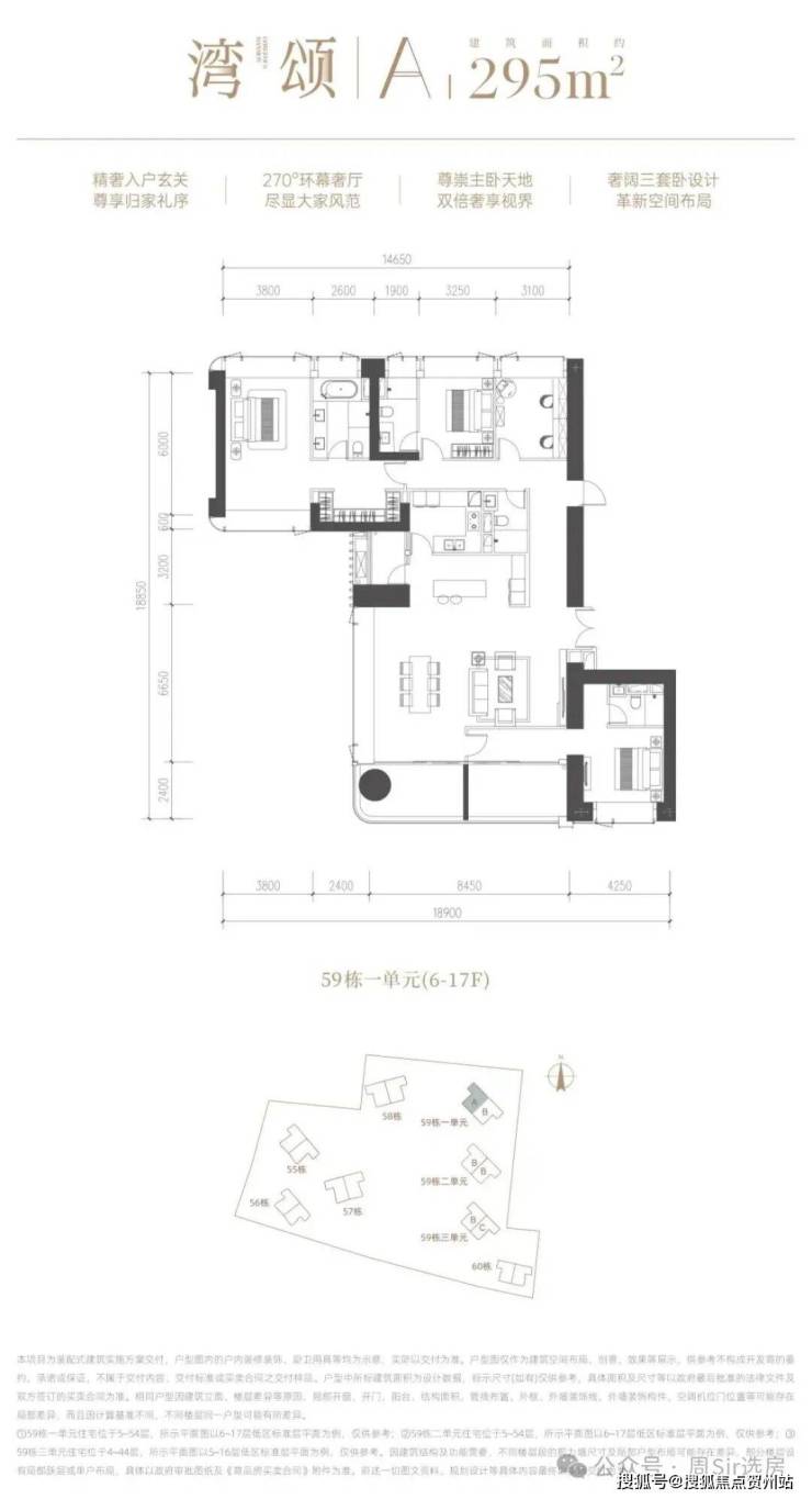 59-1栋结构类似之前的58栋,为3梯2户约255㎡和295㎡组合;