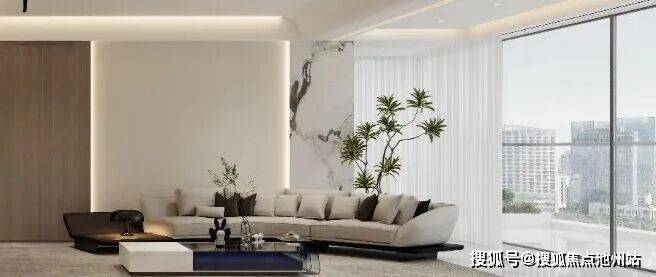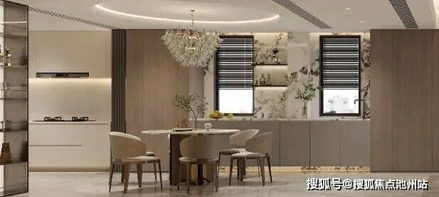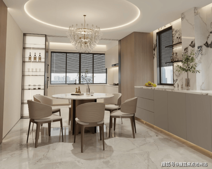 玄关以纯白收纳柜构筑宁静序曲,白色条纹大理石基座与地面浑然一体,枝条在黑色花瓶中定格为艺术剪影。餐厅中圆形大理石餐桌聚拢温馨时光,水晶吊灯与环形光晕共舞,透明酒柜为日常注入一丝轻奢。客厅素白沙发呼应着茶几的肌理,落地窗将城市景观收纳为生活背景墙。侧边的绿植无声中焕发生机,在简约中诠释着从容丰盈的日常。