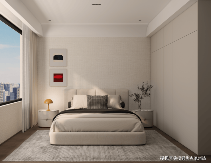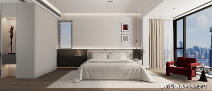 拾级而上,光与木在楼梯间共鸣,用温暖材质与光线为私密空间写下宁静序章。主卧那抹红椅成为素雅空间的灵动注脚,用设计语言书写每日的安宁诗意。南次卧作为儿童房,巧妙双层床与缤纷画作碰撞,在秩序中藏匿趣味与想象力。北次卧诠释诗意的留白,浅色背景中装饰画勾勒出精神角落,落地窗引光为伴,诠释居住的从容。