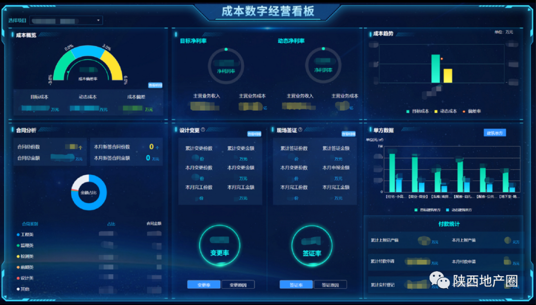 为助力数据决策,本次成本数字化建设还结合空港星皓现状及行业经验,搭建成本监控大屏,围绕目标及动态成本监控、成本变动趋势、目标及动态单方造价监控、合同监控、变更签证监控、付款情况监控等内容,对项目级成本指标进行动态监控。