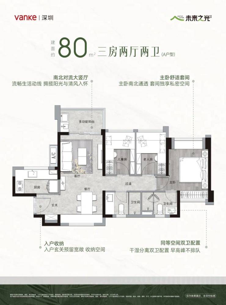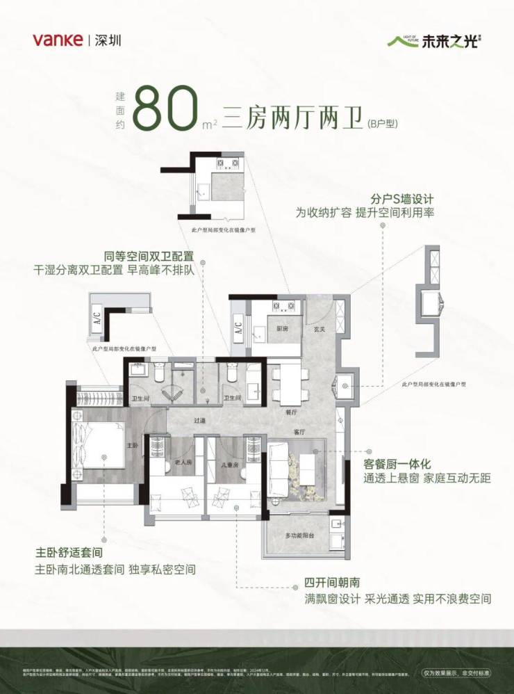 万科未来之光,最后一栋20栋一单元、二单元,!80平3房2卫,500万起!少量楼,特惠工抵房,498万起,买80平3房2卫!85折+大额返现+软装大礼包!可选楼层不多,98户型楼层可选,20栋80户型楼层可选!户型图