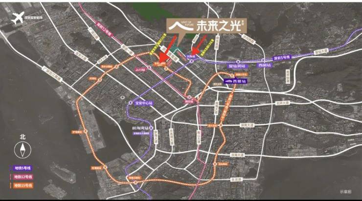 交通配套:万科未来之光周边邻近京港澳高速、南光高速、南坪快速等交通主干道,当下距离最近的是5号地铁线“兴东站”约1.8公里,楼下后期有公交首末站接驳到地铁站约20分钟,规划在建的15号地铁线“宝安公园站”距离约1.3公里。