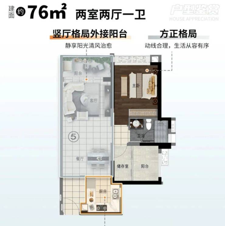 具体来看,76㎡两房户型主打紧凑实用,适合新婚夫妻或单身通勤族,空间利用率高;