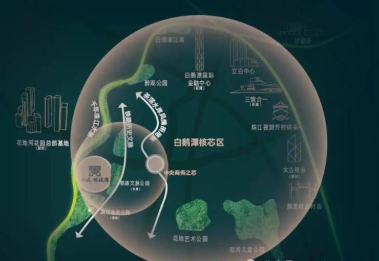 广州主城核芯,千亿白鹅潭强兑现传承千年商贸魅力,广州“十四五”规划划定荔湾新航道,锁定白鹅潭沿江经济带领头地位,斥资约2500亿投资,对标珠江新城,金融城发展战略,形成东西两翼黄金三角格局