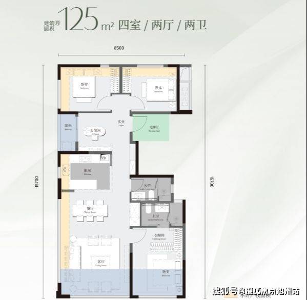 最小面积是建面约125平的四房两厅两卫。