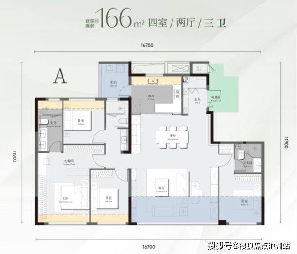最大户型是建面约166平四房两厅三卫,这个户型也有两种结构。