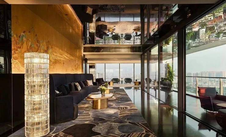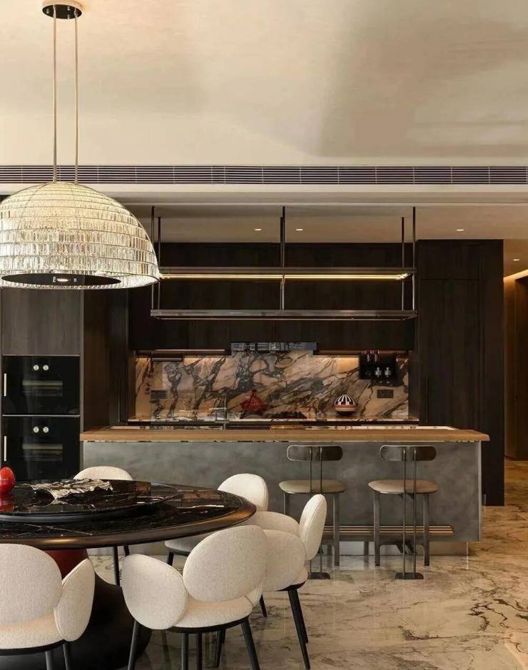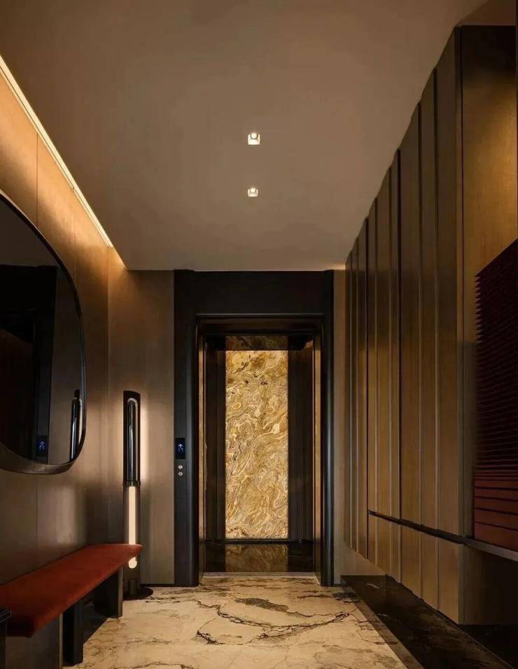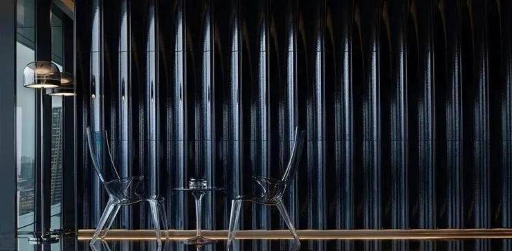 项目以“天际悦享荟”为核心社交空间,位于顶层,拥有270度全景视野,尽揽珠江壮阔与城市繁华。设计团队将“三江汇聚”的意象融入空间叙事,以超薄透光天然石与定制水波状木饰面,营造静谧光影与流动水韵的对话。胡桃木饰面搭配宝格丽黑石点缀,脚下卡慕白石纹理呼应岭南山水,红色长凳成为视觉焦点,赋予归家仪式感。蓝色陶瓷波浪墙、黑色镜面不锈钢天花与宝格丽黑石地面形成现代诗意的水韵意境,鎏金光晕延伸展开,彰显轩昂气度。