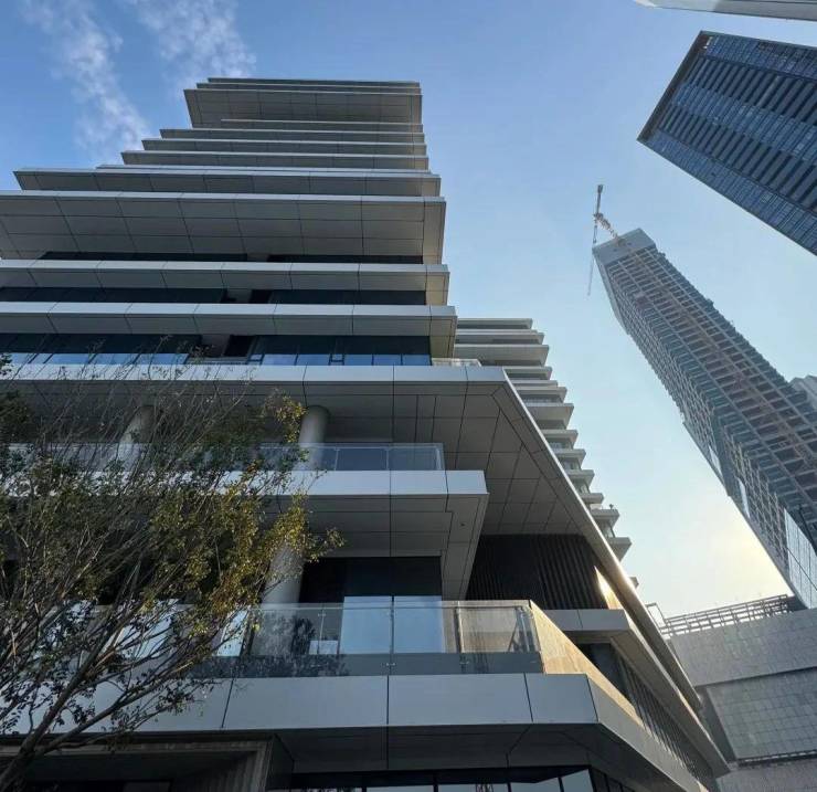鹅潭一号由全球知名建筑事务所DCM合伙人龚耕操刀设计,以“45°旋转塔楼”为核心概念,通过错台式布局与楼板错位设计,赋予建筑动态的流动感。三栋塔楼呈怀抱式布局,既消解了楼宇对视的局促感,又实现了270°无遮挡江景视野。外立面采用单元式铝合金构件与大面积玻璃幕墙,金属的沉稳与玻璃的通透形成强烈对比,光影在建筑表面流转,宛如珠江畔的灵动雕塑。