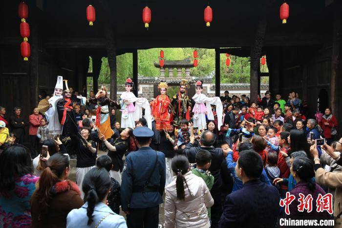 中新网重庆2月8日电(王婷婷)锣鼓响,舞步起,跟随配乐声,身着特色服饰的木偶在表演者的操纵下逐一登台,《偶戏闹春》《祈福鼓舞》……一场场热闹而具有地方民俗特色的非遗表演,让市民感受到浓浓的节日氛围。