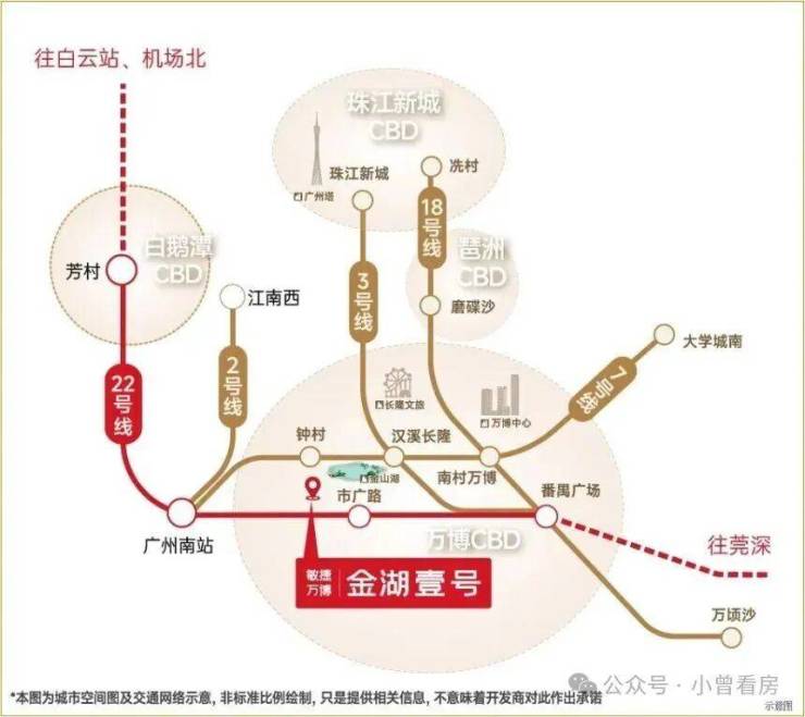 交通出行方面,项目周边有多条地铁线路覆盖,经高德地图实测,距离地铁 18 号线南村万博站约 600 米,步行 8 分钟可达;距离 7 号线万博站 D 出口约 800 米,22 号线市广路站也在 800 米范围内,通过 18 号线两站可到冼村,前往珠江新城十分便捷。