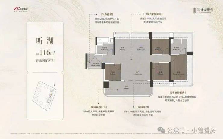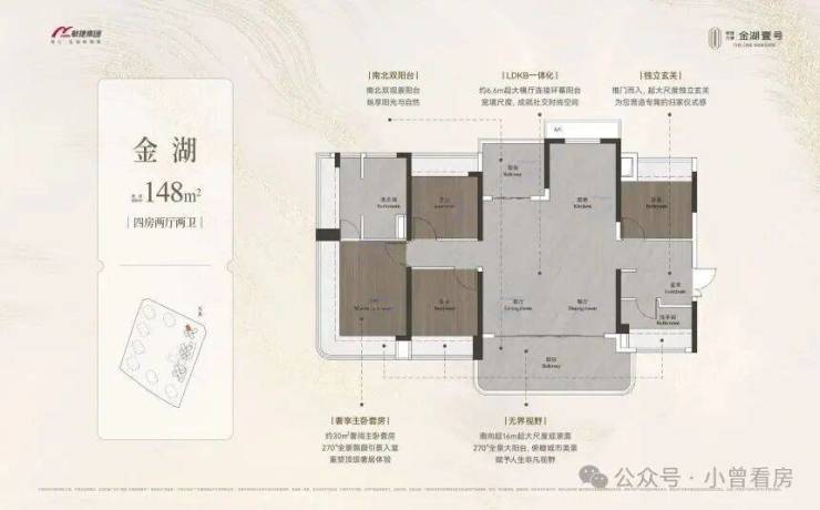 148-149㎡四房单价约 3.6 万 - 4 万元 /㎡,配备 LDKG 一体化设计,南向采光面可达约 16 米,部分房间能直接看到湖景,空间利用率较高。