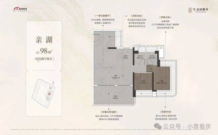 在售户型涵盖 四居室户型,98㎡四房单价与两居室相近,采用全南向设计,部分带有 270° 全景飘窗;